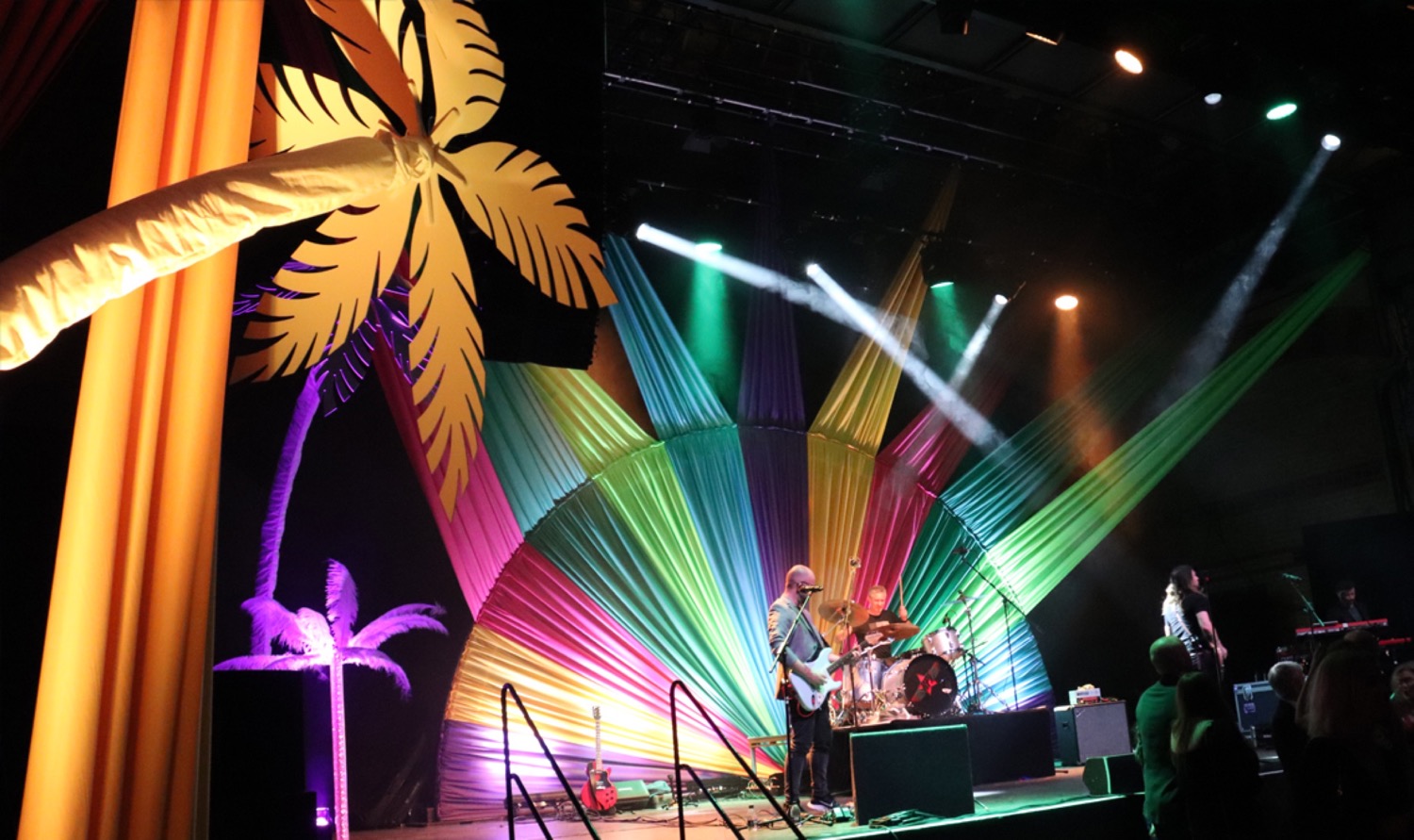 Instead of traditional round tables, we arranged long banquet tables, which not only set this event apart from previous ones but also enhanced the festival atmosphere and encouraged a more communal and interactive dining experience. To elevate the visual appeal, each table featured giant pixel-feather centerpieces, programmed to change colors throughout the evening, adding a dynamic and playful element to the room. Around the perimeter, large, illuminated palm trees added to the tropical festival vibe, creating a stunning, immersive backdrop.